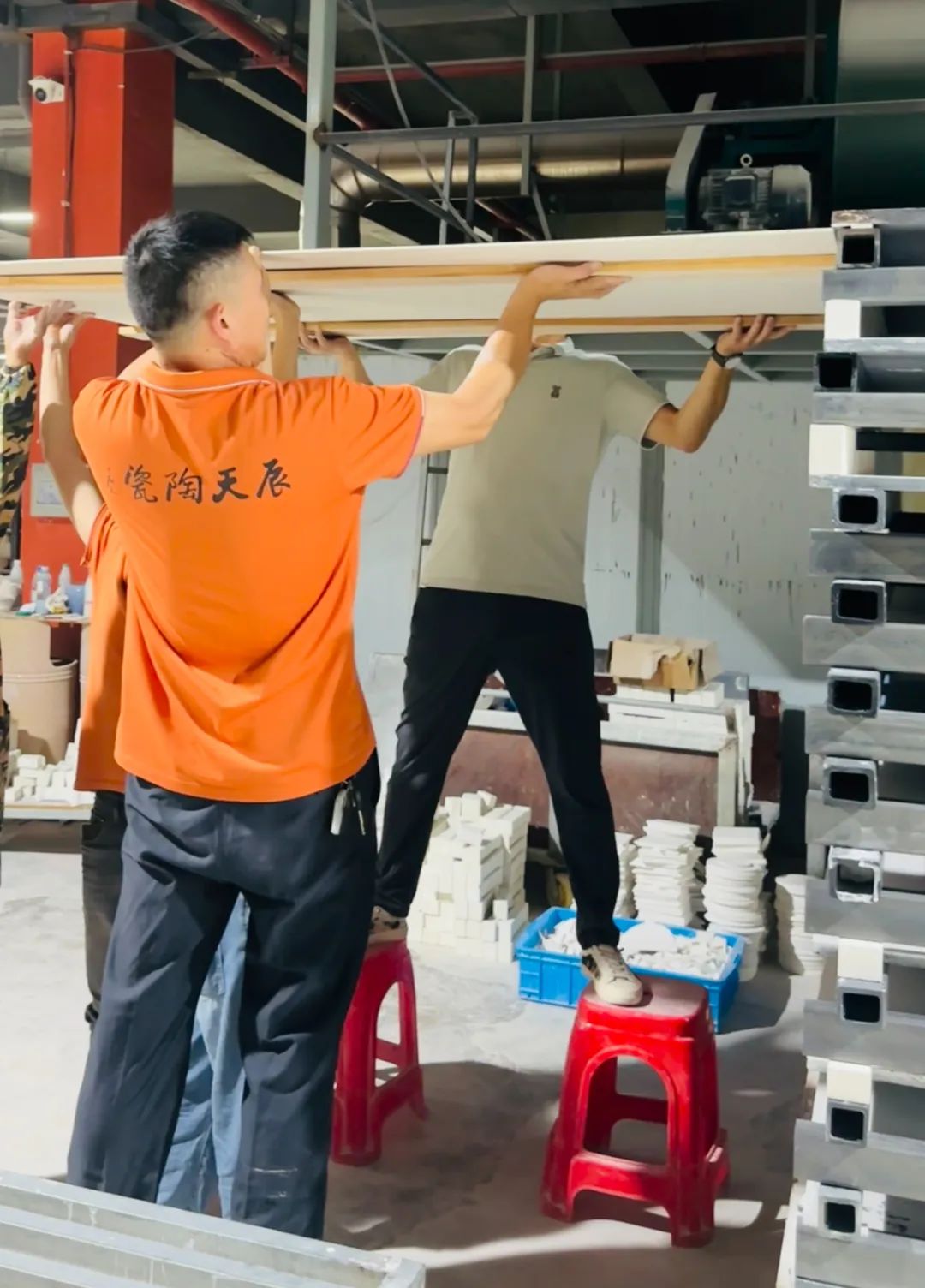 在法布里斯完成其創作后,還迎來了至關重要的一步——燒制。由于瓷板尺寸較大,需要專門搭窯來燒制,并且需要師傅嚴格把控燒制的溫度和時間,憑借師傅豐富的經驗,最終成品得以完美呈現。